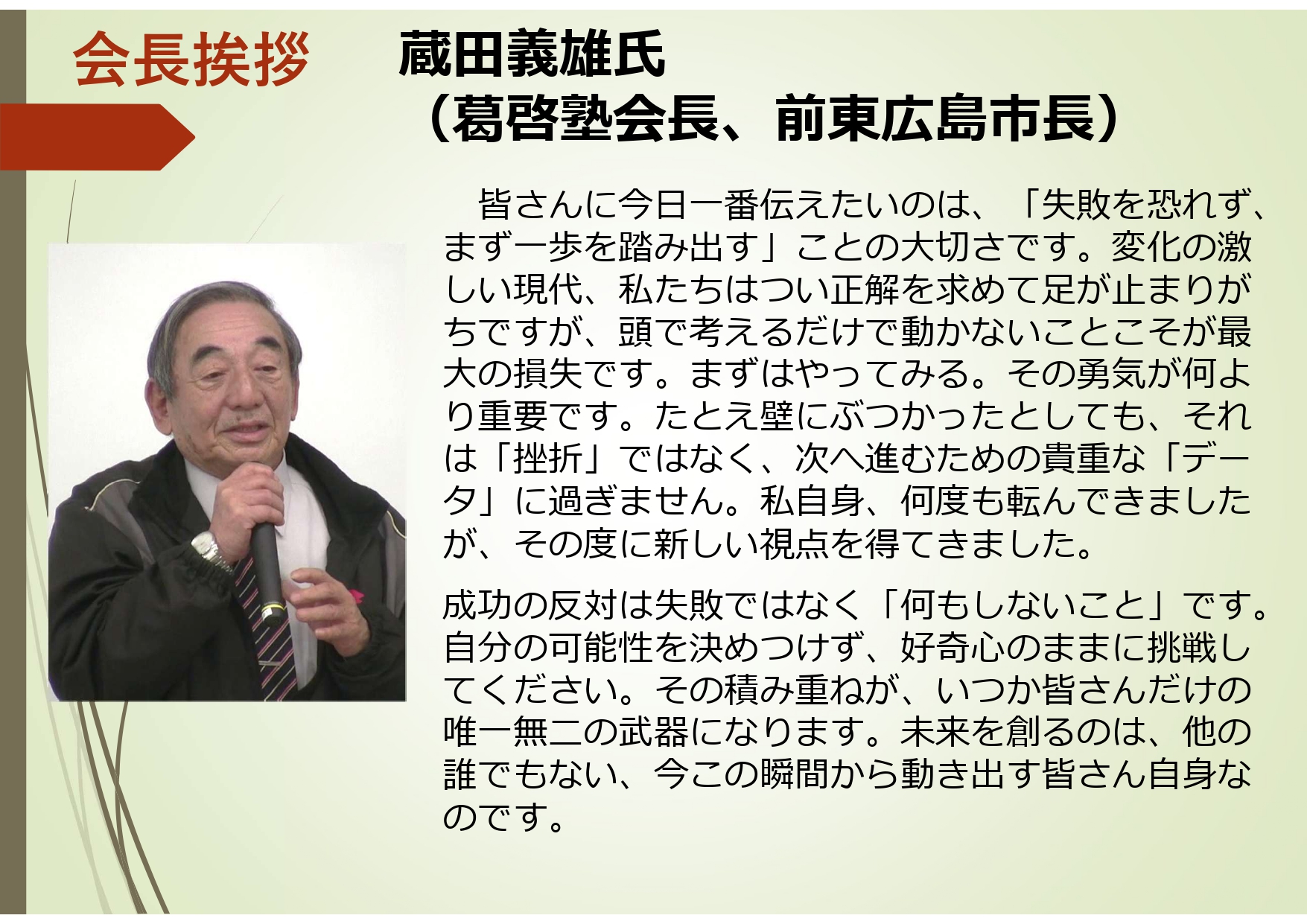 〇会長挨拶 蔵田義雄会長(東広島前市長)→映像はこちら